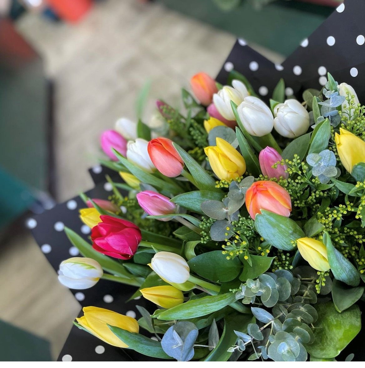 זר 23 טוליפים צבעוניים באריזת גליונות אלגנטית