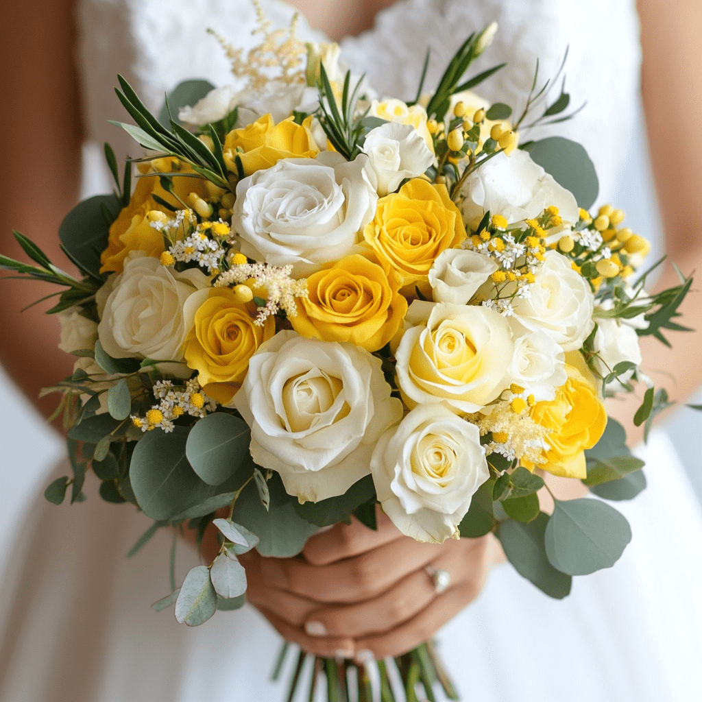 כלה 44 – זר פרחים לכלה – ורדים צהובים, ורדים לבנים, בבונג, סולידסטר והיפריקום צהוב