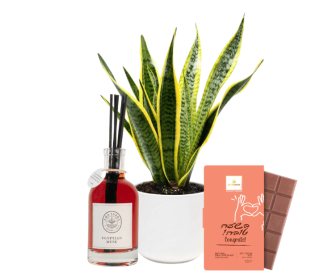 סנסיווריה 12" בכלי לבן עם מפיץ ריח ושוקולד "בשעה טובה"