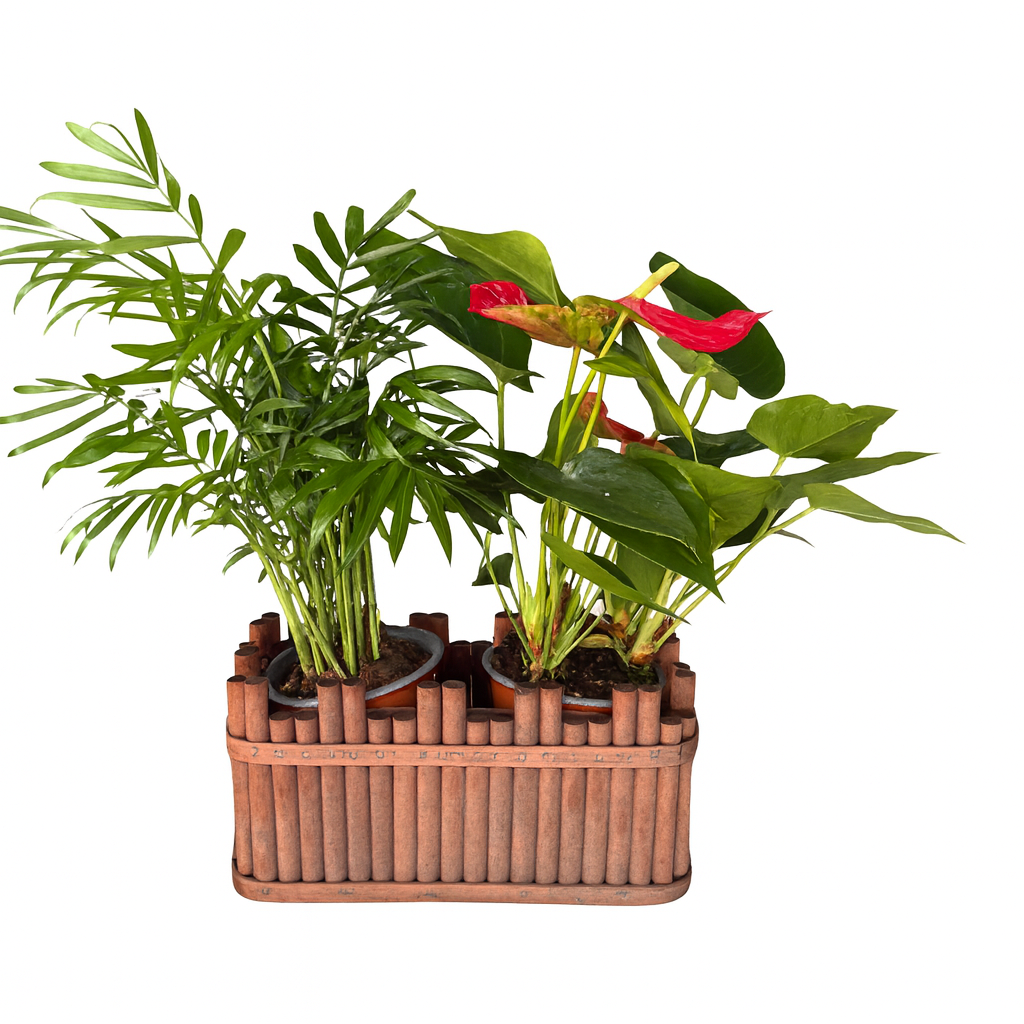אדנית עץ מרובעת קטנה עם אנטוריום וכמדוריאה