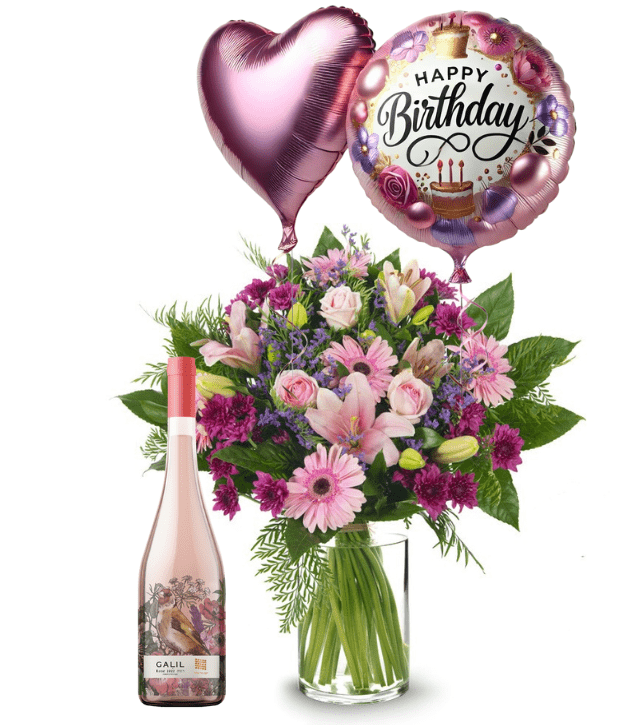 זר נוף ילדות בינוני עם מיקס בלונים – HAPPY BIRTHDAY ולב מיילר  בתוספת יין רוזה