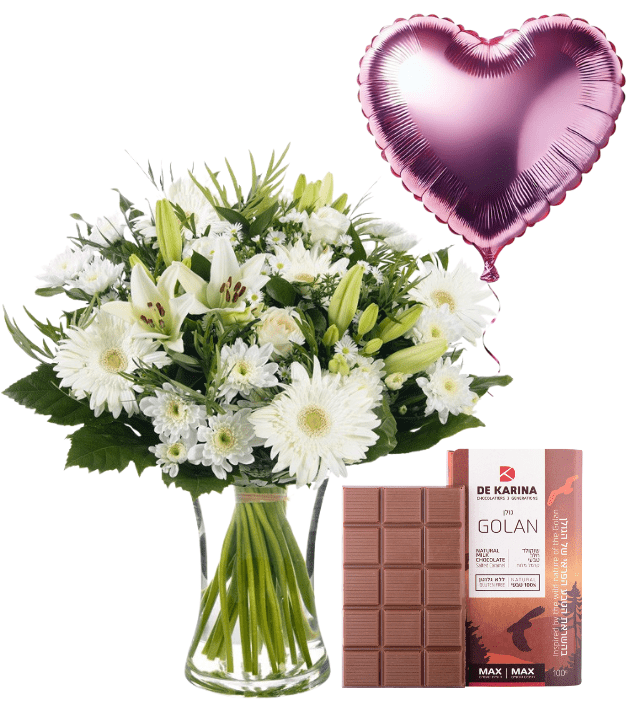 זר שבתות בינוני בלון לב ורוד ושוקולד גולן חלב כרמל