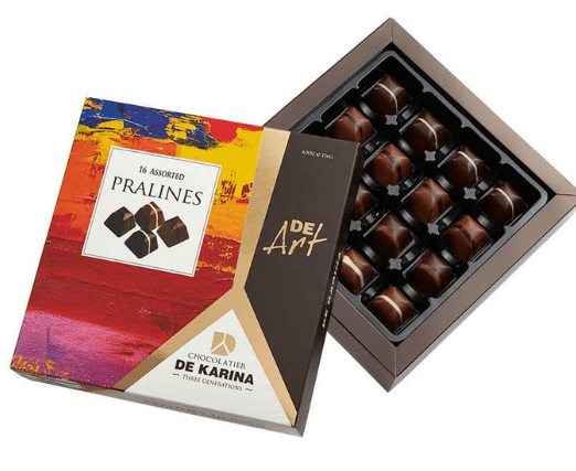 16 פרלינים במבחר מילויים קטיפתיים קפה נוגט, קרם מוקה, קרמל, תפוז חלבי,