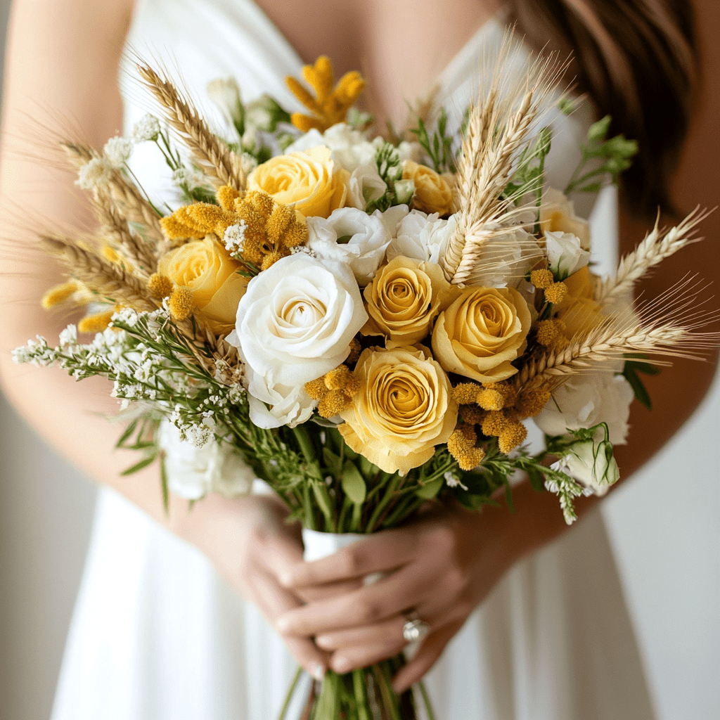 זר כלה כפרי בצבעי צהוב לבן בשילוב שיבולים