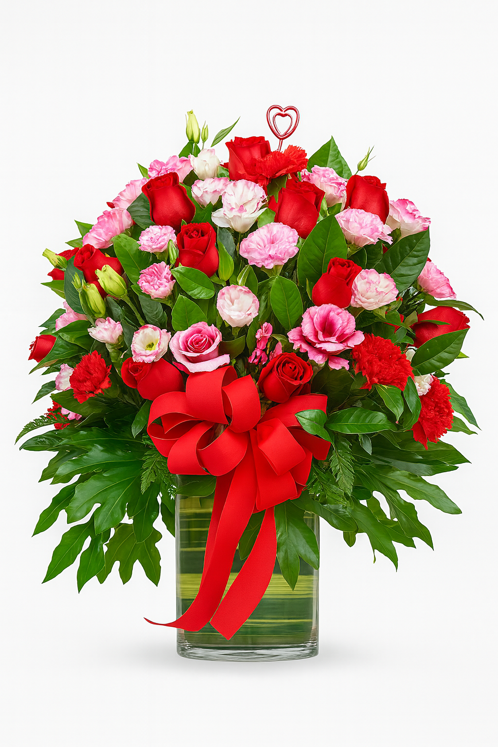 סידור בכלי המכיל ורדים אדומים, ציפורן ורוד, ליזיאנטוס לבן עם נגיעות ורודות וענפי ירק וקישוט מגוונים.