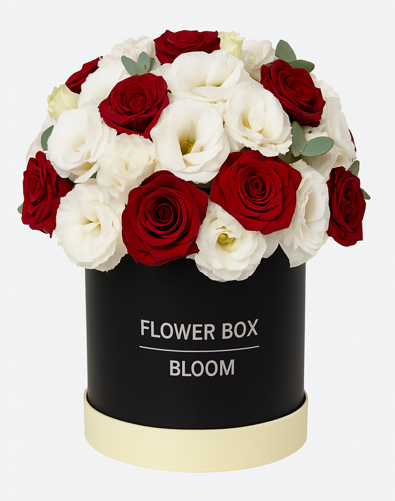 פרחי ליזיאנטוס לבנים וורדים אדומים מעוצבים בקופסת פרחים בתוספת ענפי אקליפטוס