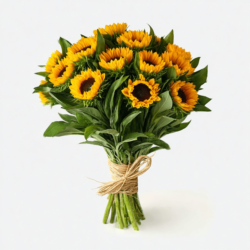 זר פרחים קיצי ורענן בצבע צהוב בוהק בתוספת כמה סוגים שונים של ענפי ירק.